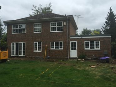 The works were extensive and exacting. The interior was taken back to shell condition, new electrics, cat 6 wiring, new water system, and underfloor heating. Extensions over the garage, and to the rear of the property added over 1200 square feet of living space. To create a fluid flow, 18 steel beams were used to make sure the layout feels natural. Unable to source roof tiles of the same colour to the originals, the entire roof was retiled. All the windows were replaced with Roseview ultimate rose sash windows, and over 60 tonnes of top soil were added to the rear garden to provide a flat lawn. Block paving to the front, and over 1500 square feet of porcelain tiles provide the rear patios. The front door and side gates are made from solid oak, and were commissioned for us by local craftsmen.
